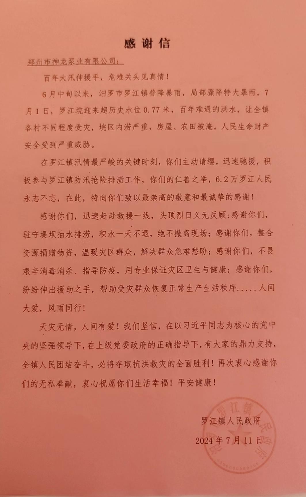 罗江镇人民政府发来感谢信